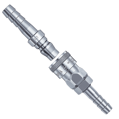 有優(yōu)越通用性的快速接頭,可用于從工廠的空氣配管到空氣工具的軟管 連接的各類(lèi)用途。 ●鋼鐵材質(zhì)適用于空氣,黃銅、不銹鋼材質(zhì)適用于水。 但是,分離時(shí)流體從插塞一側(cè)流出來(lái),敬請(qǐng)注意。 ●鋼鐵材質(zhì)的重要構(gòu)成部件經(jīng)過(guò)熱處理增加了強(qiáng)度。有良好的耐磨損性和耐久性。 ●主體材質(zhì)與尺寸種類(lèi)豐富,安裝形狀標(biāo)準(zhǔn)化,可用于廣泛的空壓用途。