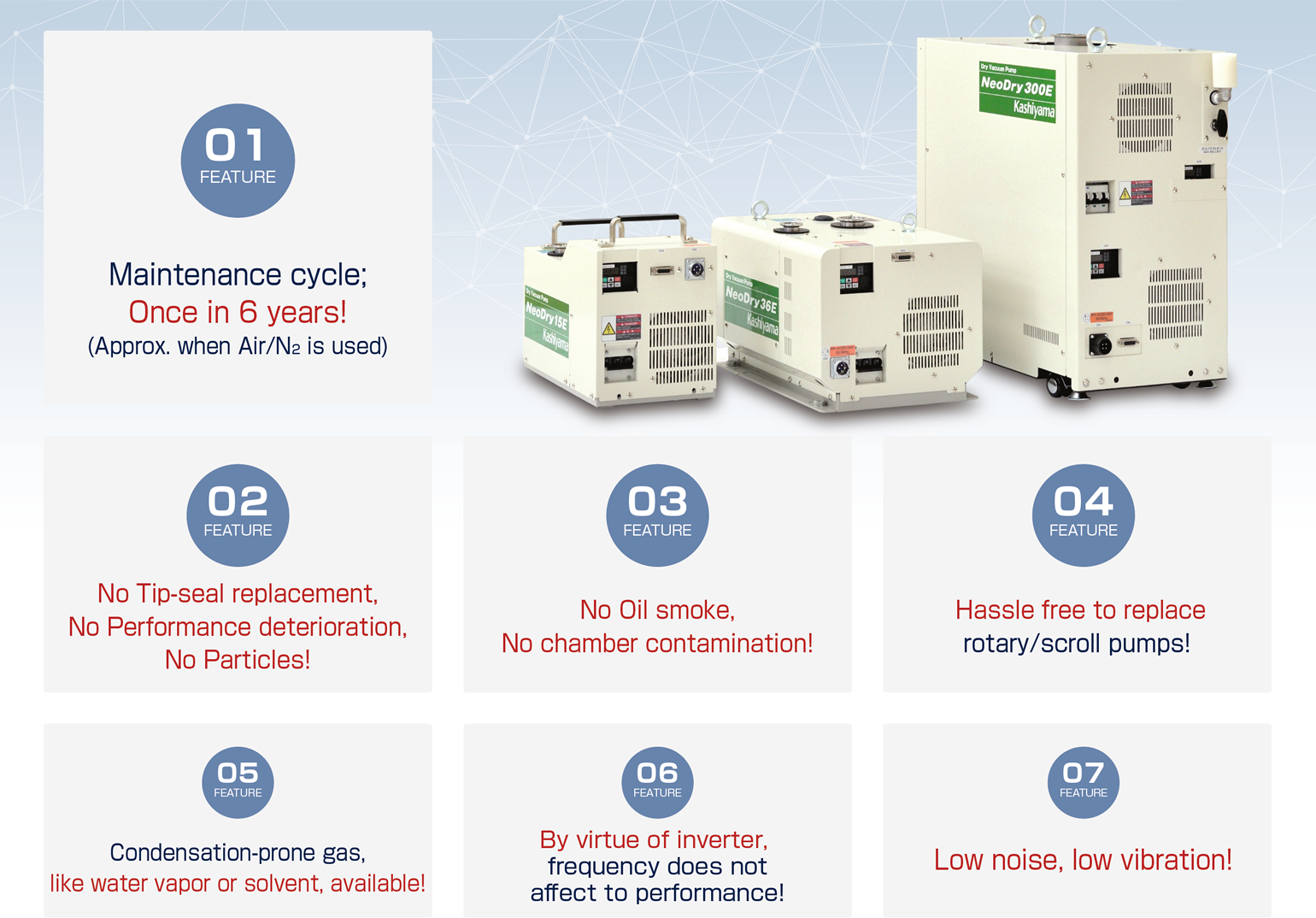 維護周期;3年一次!(使用Air/N2時約)無需更換尖端密封件,不會降低性能,不會產(chǎn)生顆粒!無油煙,無腔室污染!更換旋轉(zhuǎn)/渦旋泵無憂無慮!容易結(jié)露的氣體,如水蒸氣或溶劑,可用!憑借變頻器,頻率不影響性能!低噪音,低振動!