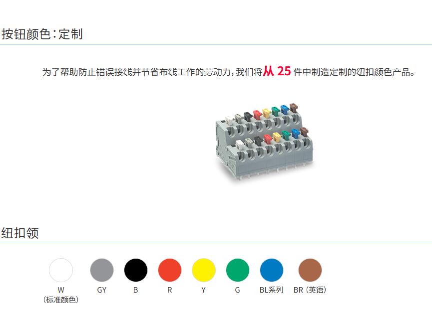 為了幫助防止錯誤接線并節(jié)省布線工作的勞動力,我們將從 25 件中制造定制的紐扣顏色產(chǎn)品。